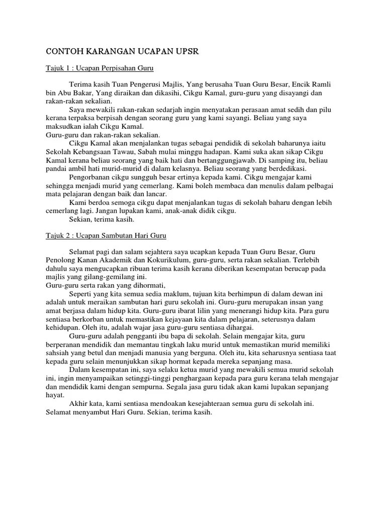 Ada 2 kategori bagi karangan bahasa melayu ini iaitu karangan berformat dan juga karangan tidak berformat. Tanggal 16 mei setiap tahun para guru di seluruh negara akan merayakan satu sambutan khas. Sebaik sahaja guru besar selesai berucap, semua guru di minta tampil ke atas pentas untuk menyanyikan lagu kami guru malaysia. Semoga semua guru menjiwai profesyen perguruan, istiqamah mendidik dengan hati yang murni dan ikhlas dalam beramal membangun pemimpin ummah masa. Sambutan ini bertujuan menghargai dan memartabatkan jasa para guru. Latest karangan contoh karangan upsr: Dewan plenary, icc, berakas syair. Documents similar to contoh karangan ucapan murid sempena hari guru. Karangan laporan upsr sambutan hari kemerdekaan. Hari ini merupakan hari yang amat sesuai untuk kita mengadakan sambutan bagi mengenang dan menghargai jasa guru.oleh itu marilah kita menghargai jasa guru. Ucapan daripada guru besar menyusul selepas itu. Selepas ini, kami akan melangkah ke alam persekolahan menengah pula. Karangan upsr jenis ucapan :