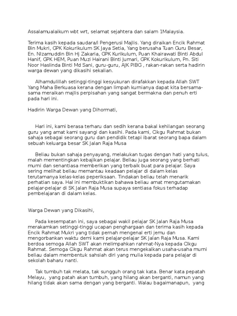 Doc doa perpisahan guru berpindah suhaim haron academia edu. 41499971 teks ucapan majlis persaraan guru besar. Teks ucapan majlis perpisahan pegawai polis. Teks pengerusi majlis persaraan guru besar teks pengerusi majlis sanjungan budi lambaian kasih. Teks pengacara majlis majlis perpisahan guru pindah perpisahan diiringi dengan air mata mak milah.